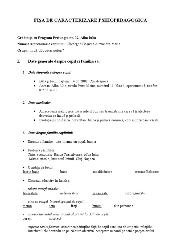 2 Source from : Kölcsey Ferenc FÅ'gimnázium Data nasterii:6.06.1995 locul nasterii:targoviste domiciliul actual: Descarca proiectul cu titlul fisa psihopedagogica pentru doar 5 euro (card bancar / sms descarca aceast proiect cu doar 5 €. Fişa psihopedagogică poate reprezenta un instrument extrem de util cadrului didactic, realizabilă la orice nivel de învăţământ sau cuclu curricular, atâta vreme cât este completată corect, cu responsabilitatea cuvenită şi cu conştiinţa valorii ei în munca educativă. Fişa psihopedagogică a copilului preşcolar grădiniţa: Se vor preciza în mod obligatoriu traseul educaţional complet al elevului până în momentul completării prezentei fişe, respectiv denumirea instituţiei/instiţutiilor frecventate, tipul/tipurile de.