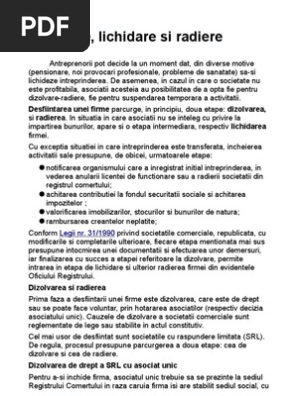 vizitati articolul complet aici : https://www.infiintari-firme-yna.ro/dizolvare-firma-lichidare-radiere/ 31/1990 privind societățile comerciale, după terminarea lichidării, lichidatorii trebuie să solicite oficiului registrului comerțului radierea înmatriculării din registrul comerțului în termen de 15 zile de la dată ultimului act de lichidare, care este repartizarea activului net între asociați. Desfiintarea unei firme parcurge, in principiu, doua etape: Procedura de desfiintare a unei.